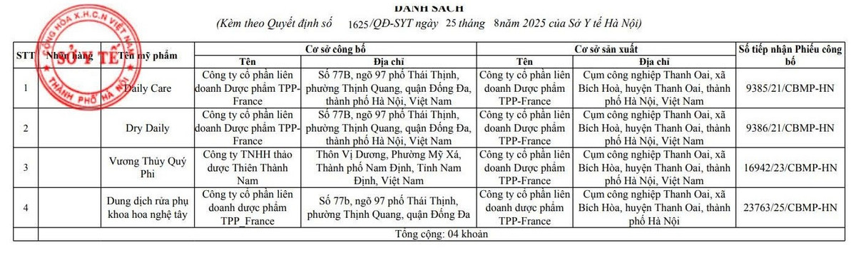 Sở Y tế Hà Nội vừa ban hành Quyết định số 1625/QĐ-SYT ngày 25/8/2025 về việc thu hồi Giấy chứng nhận đủ điều kiện sản xuất mỹ phẩm của Công ty cổ phần Liên danh dược phẩm TPP-France.