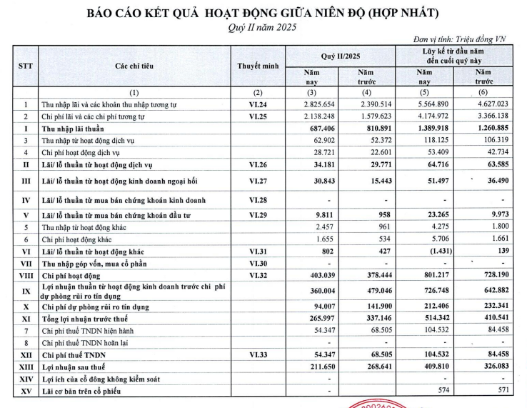 Chi phí dự phòng rủi ro tín dụng trong quý cũng được cắt giảm 34%, còn 94 tỷ đồng. Tuy nhiên, lợi nhuận sau thuế quý II vẫn chỉ đạt 212 tỷ đồng, giảm 21% so với cùng kỳ năm trước.