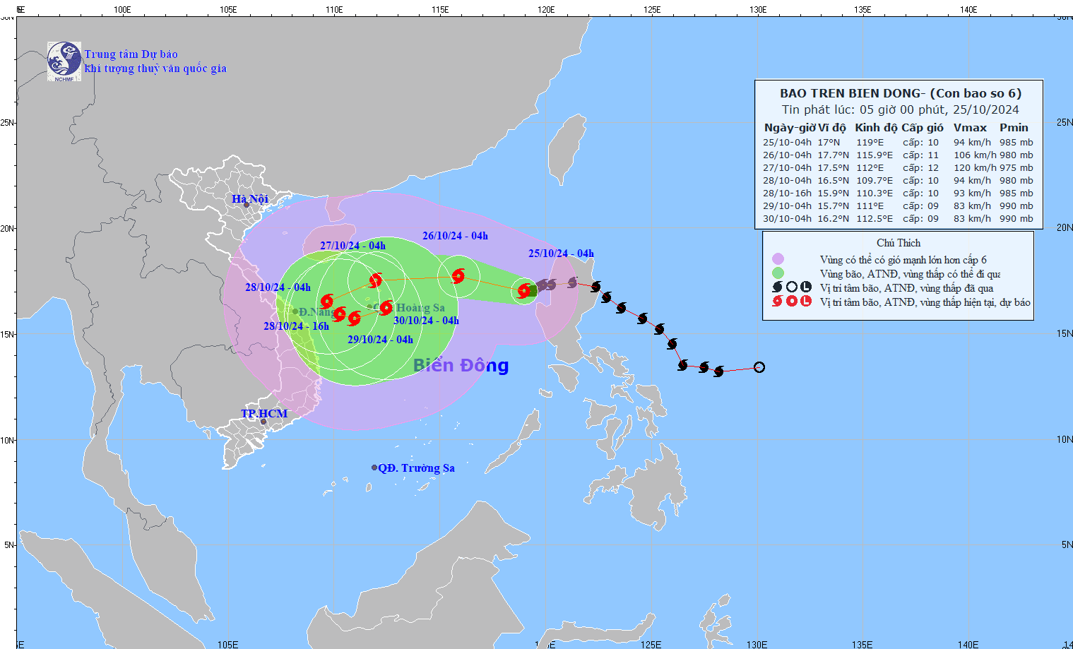 Hồi 04 giờ ngày 25/10, vị trí tâm bão ở vào khoảng 17,0 độ Vĩ Bắc; 119,0 độ Kinh Đông, trên vùng biển phía Đông của khu vực Bắc Biển Đông (Ảnh: Trung tâm dự báo khí tượng thủy văn quốc gia)