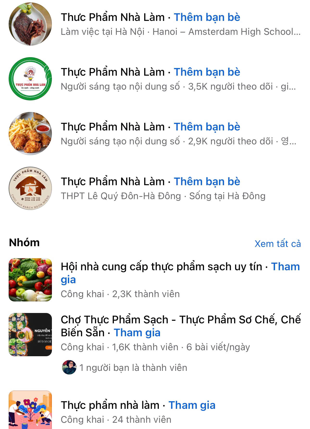 Chỉ cần gõ từ khóa "thực phẩm nhà làm" lên mạng xã hội là cho ra hàng loạt các tài khoản bán.