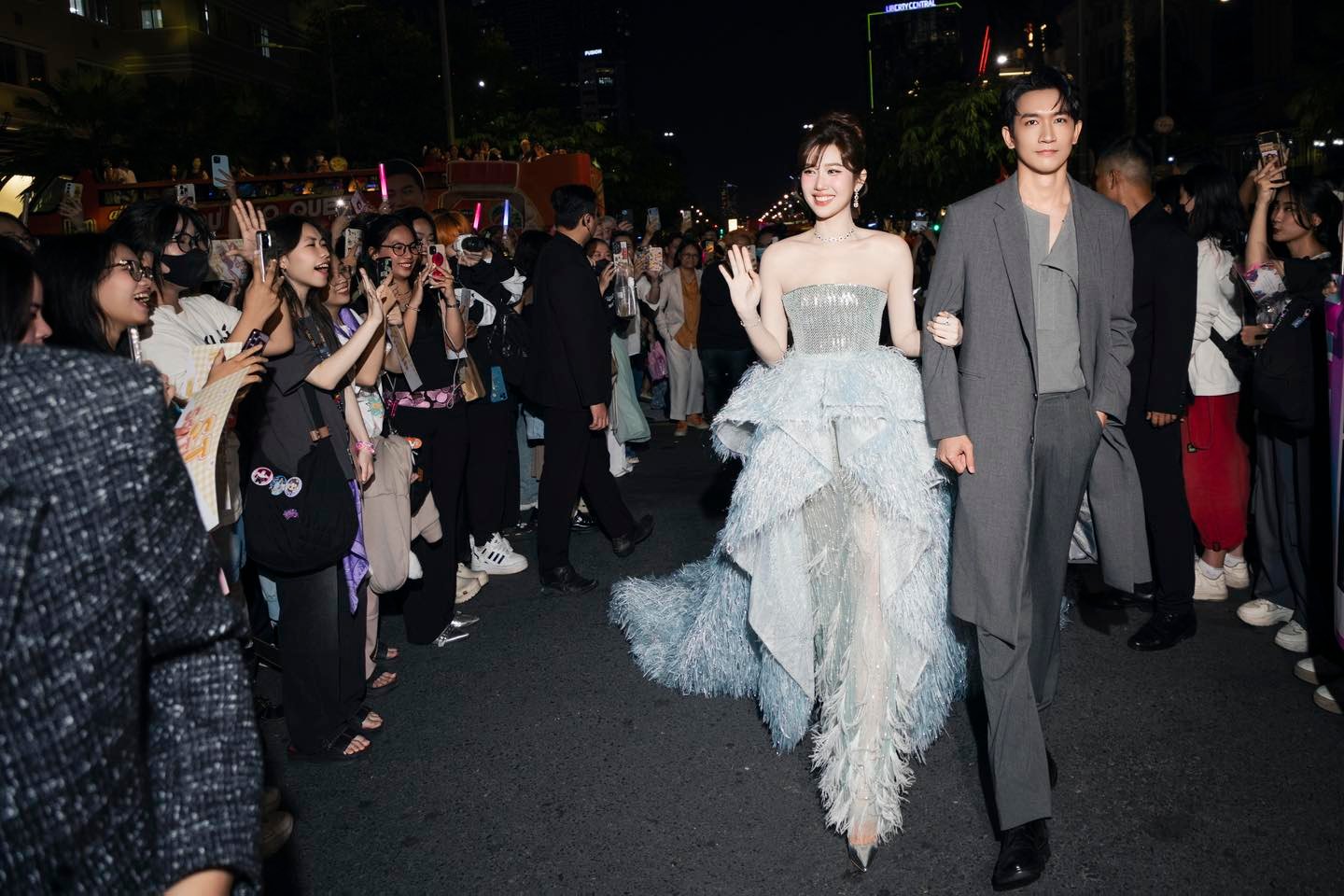 Ở event khác, sải bước trên thảm đỏ, Võ Cảnh và Thúy Ngân lên đồ ăn ý với sắc trắng tinh khôi.