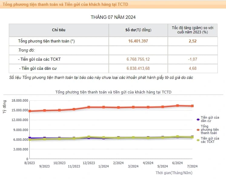 Theo số liệu từ Ngân hàng Nhà nước (NHNN), tính đến tháng 7/2024, tiền gửi của người dân vào hệ thống ngân hàng đạt hơn 6,838 triệu tỷ đồng, tăng 305.672 tỷ, tương ứng với 4,68% so với thời điểm cuối năm 2023.