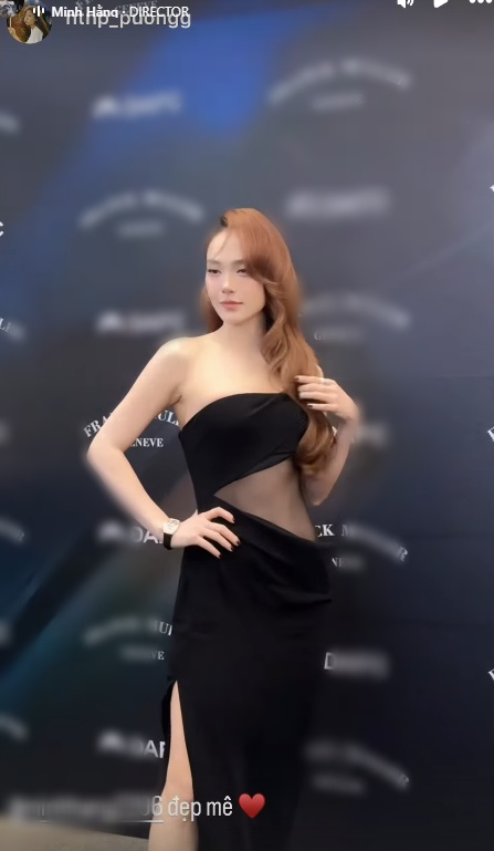 Trong khi đó, "phú bà" Minh Hằng gợi cảm với đầm xuyên thấu, phom cúp ngực khoe vóc dáng "mẹ một con trông mòn con mắt". Minh Hằng cũng lựa chọn đồng hồ cùng thương hiệu với Tiên Nguyễn.