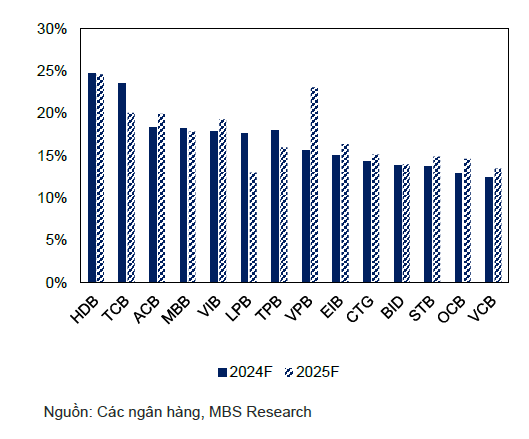 Kỳ vọng tăng trưởng tín dụng sẽ đạt 17-18% trong năm 2025, tuy nhiên MBS Research hạ dự báo tăng trưởng lợi nhuận ròng của các ngân hàng theo dõi xuống còn 17.7% do thu nhập lãi thuần được dự báo sẽ giảm do khó khăn trong việc tăng trưởng NIM mặc dù dự báo tăng trưởng tín dụng cao hơn.