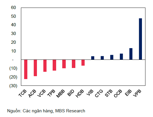 Theo ghi nhận của MBS, năm 2024, lãi suất cho vay trung bình của các ngân hàng niêm yết đã giảm mạnh 240 điểm cơ bản so với cùng kỳ. Tất cả các ngân hàng đều ghi nhận giảm lãi suất cho vay trong năm 2024. Nhờ vào chi phí vốn giảm 189 điểm cơ bản so với cùng kỳ, NIM của các NHNY chỉ giảm nhẹ 10 điểm cơ bản so với 2023, đạt mức 3.41%. Nhìn chung, hầu hết các ngân hàng ghi nhận NIM giảm so với cùng kỳ, trong đó MBB và VIB là những ngân hàng có mức giảm mạnh nhất, lần lượt 84 điểm cơ bản và 100 điểm cơ bản.