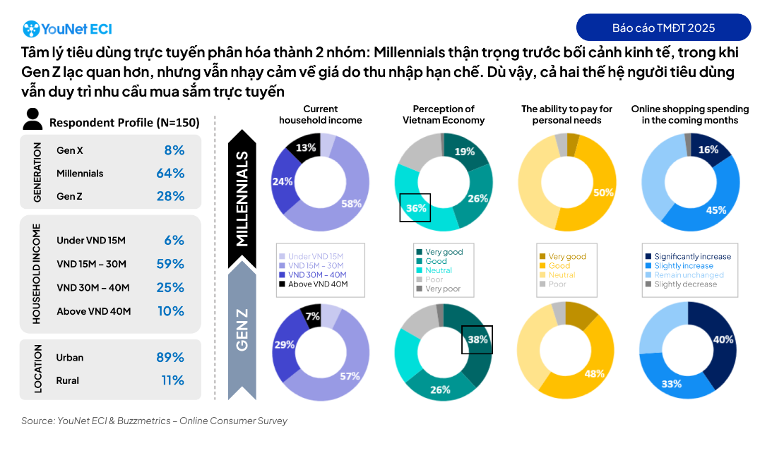 Khảo sát người tiêu dùng trực tuyến do YouNet ECI phối hợp Buzzmetrics thực hiện trong quý 4/2025 cho thấy mức độ nhạy cảm giá cao. Nhóm Gen Y tỏ ra thận trọng khi đánh giá tình hình kinh tế, với 36% giữ thái độ trung lập và 45% cảm thấy tích cực. Trong khi đó, Gen Z lạc quan hơn khi 64% đánh giá tích cực về kinh tế, nhưng 64% trong số này có thu nhập hộ gia đình dưới 30 triệu đồng/tháng, khiến khả năng chi tiêu bị hạn chế.