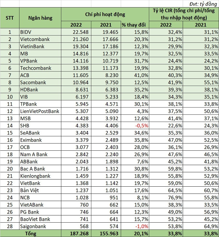 Số liệu thống kê từ báo cáo tài chính quý IV/2022 của 28 ngân hàng, chi phí hoạt động hầu hết tăng. Tổng chi phí hoạt động của 28 ngân hàng lên đến 187.268 tỷ đồng, tăng hơn 20% so với năm trước.