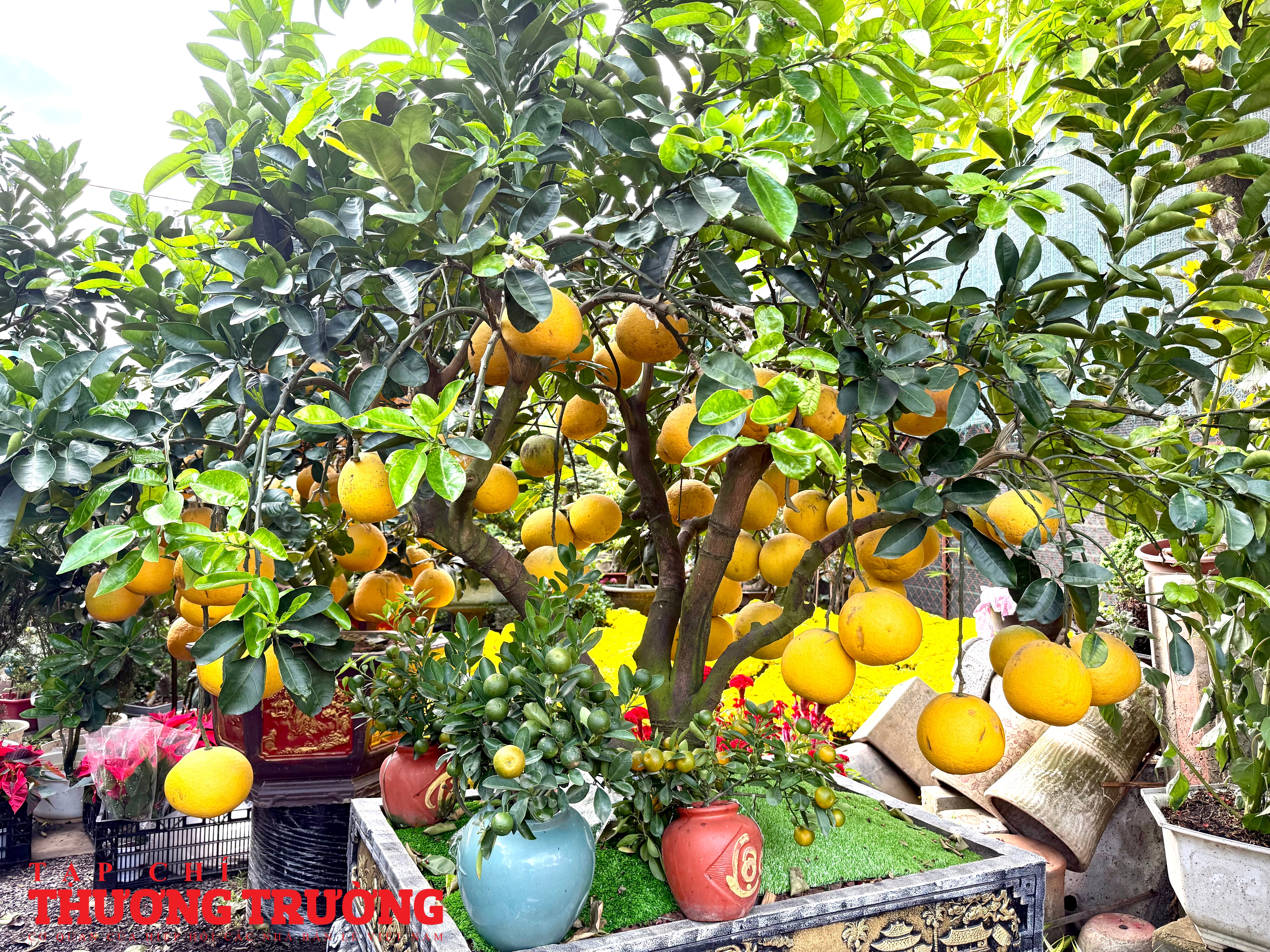 Bưởi Diễn chưng Tết được tạo dáng tròn đều, tán cây cân đối, quả vàng óng, đáp ứng tiêu chí “đa quả – đẹp tán – bền lá” của người chơi cây cảnh.