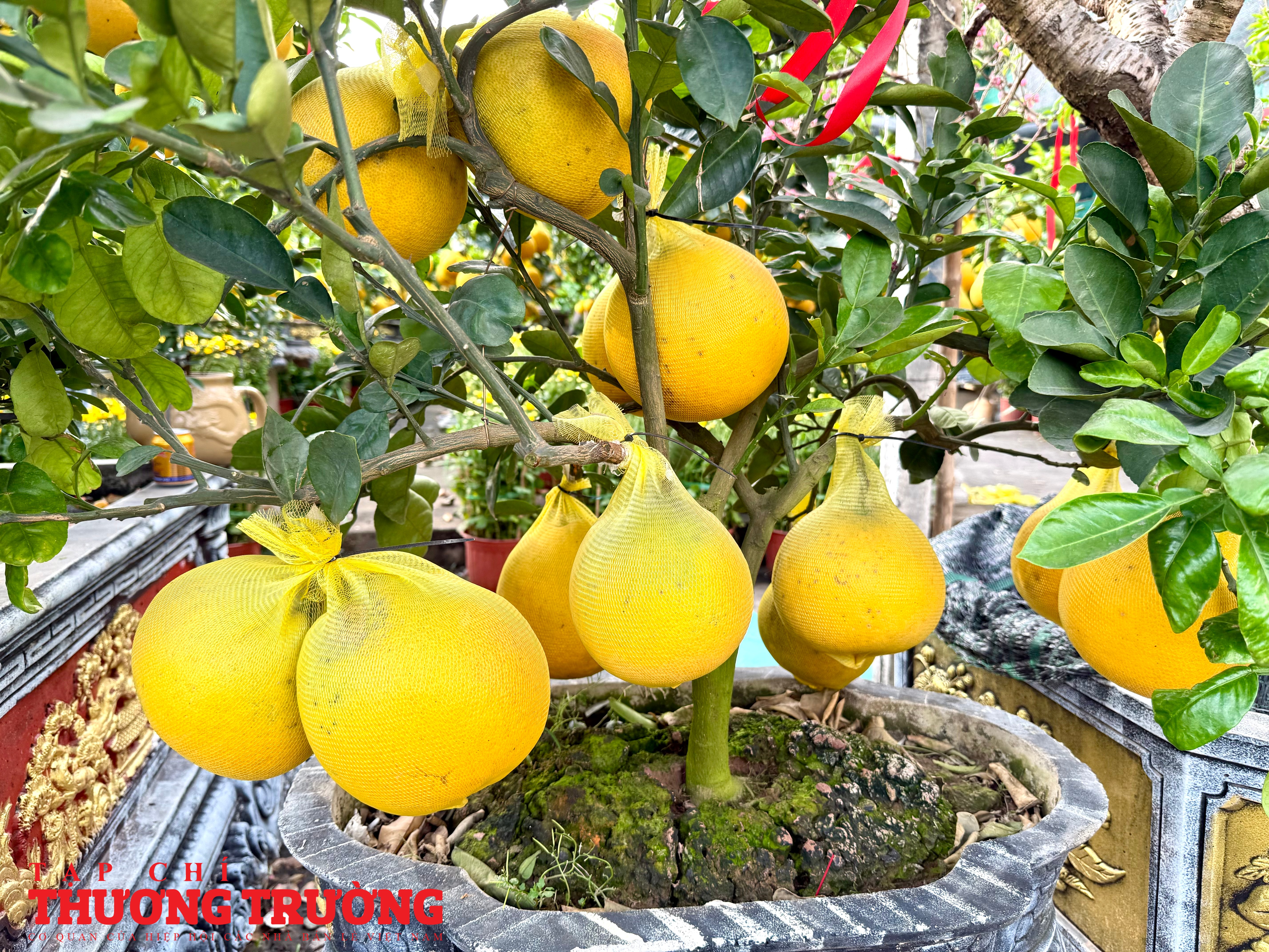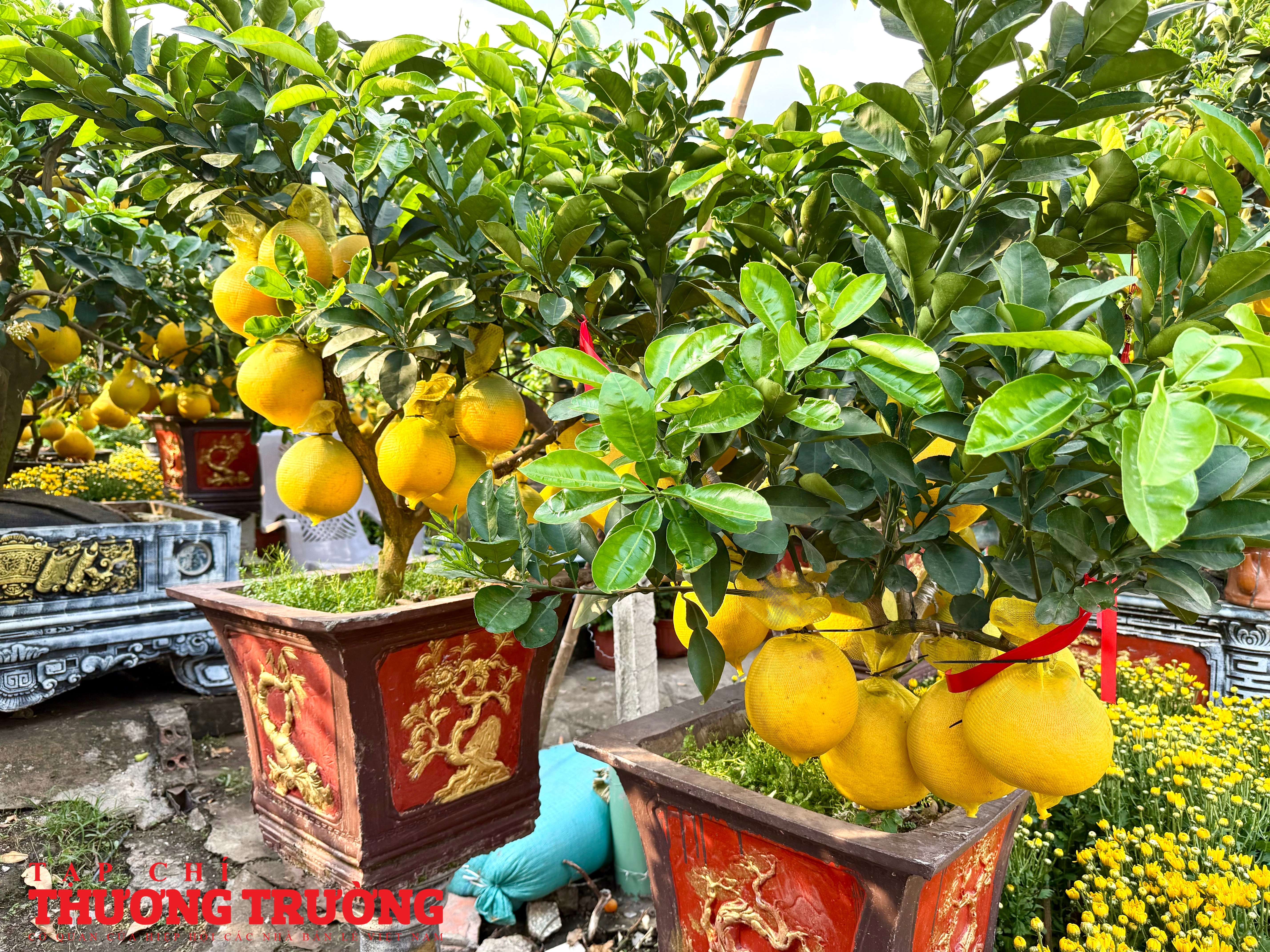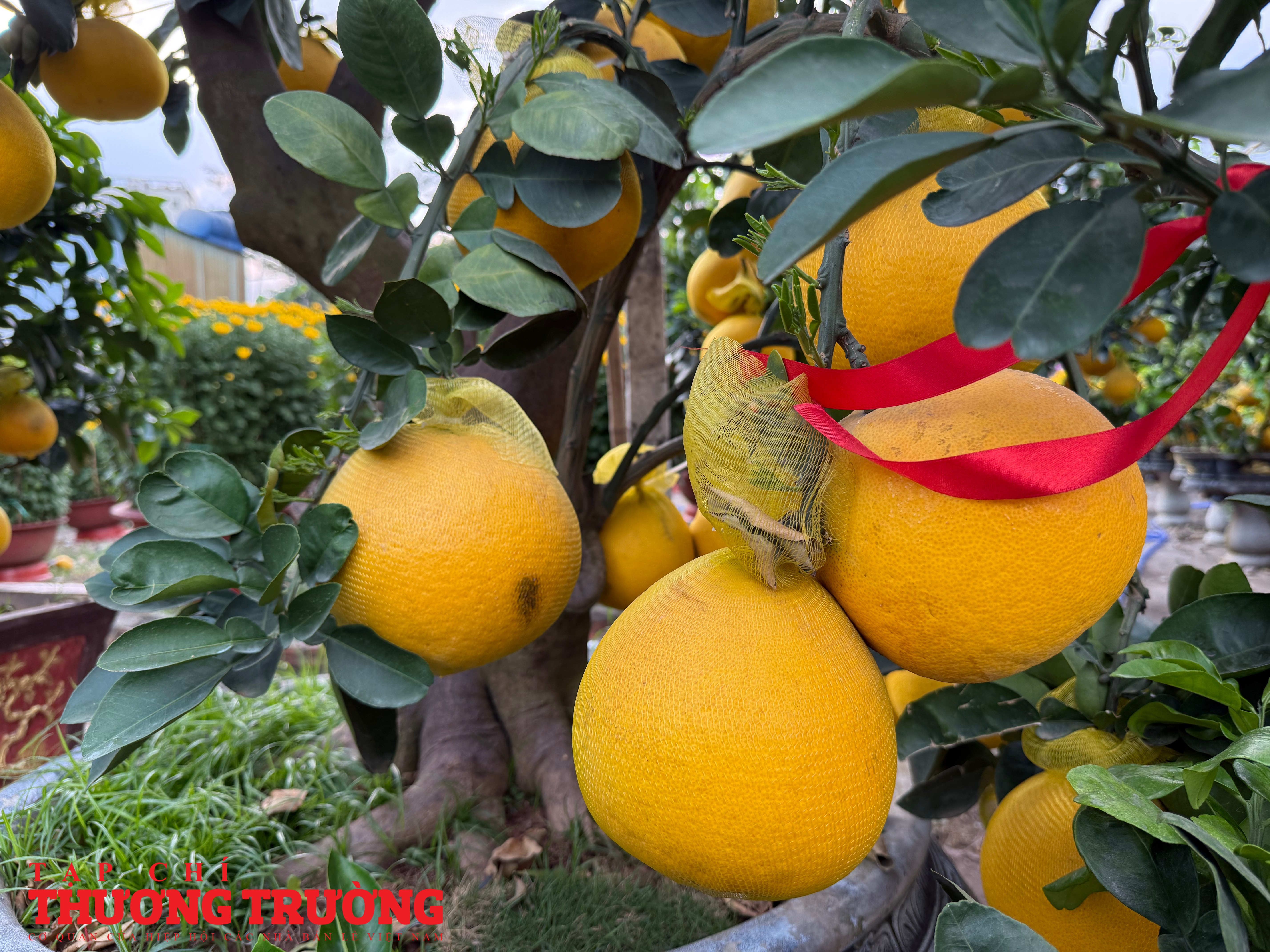Một số chậu bưởi lớn được trang trí thêm bao lì xì, dây đỏ, câu đối nhỏ để tăng không khí Xuân và giá trị trưng bày.