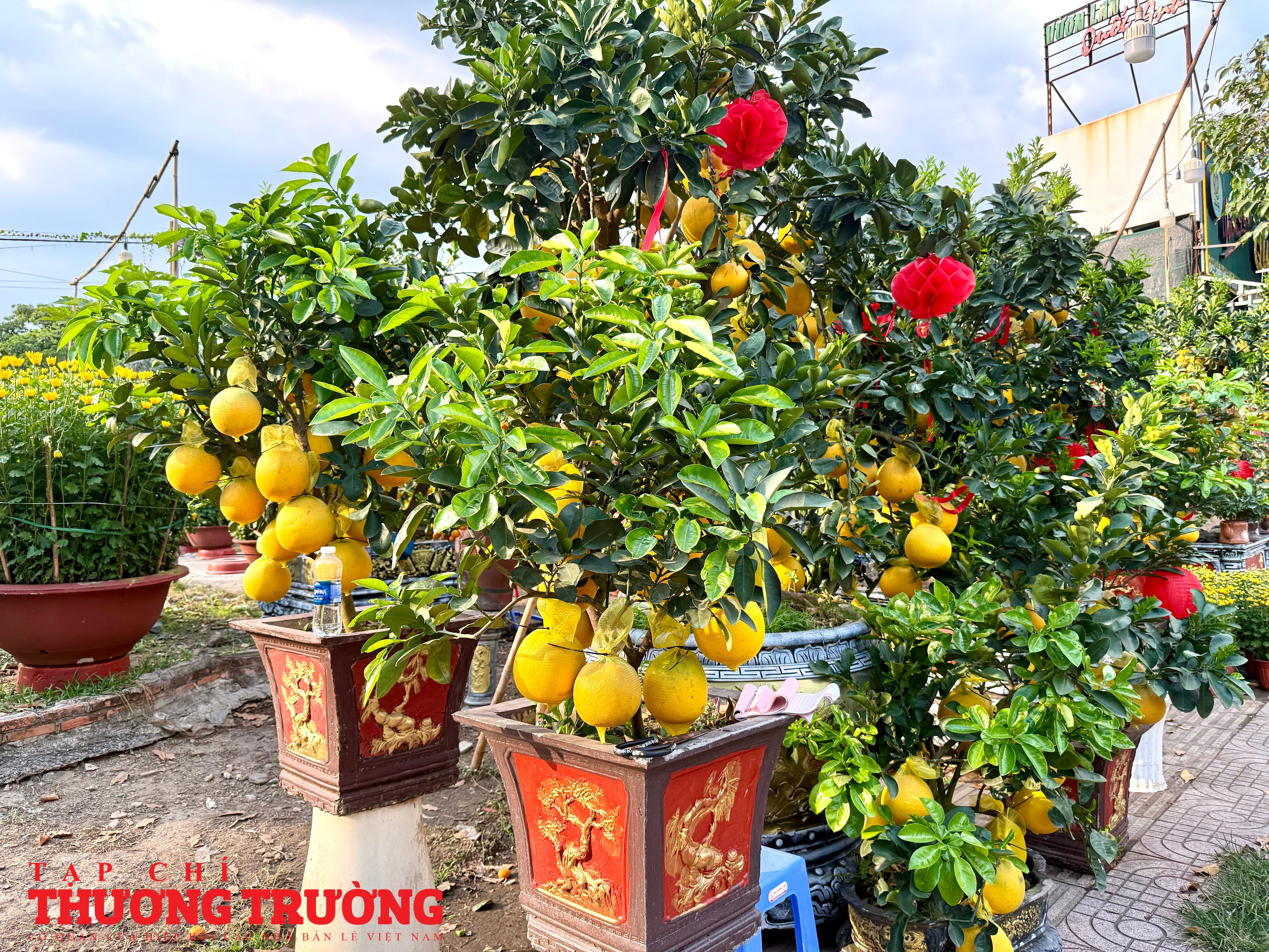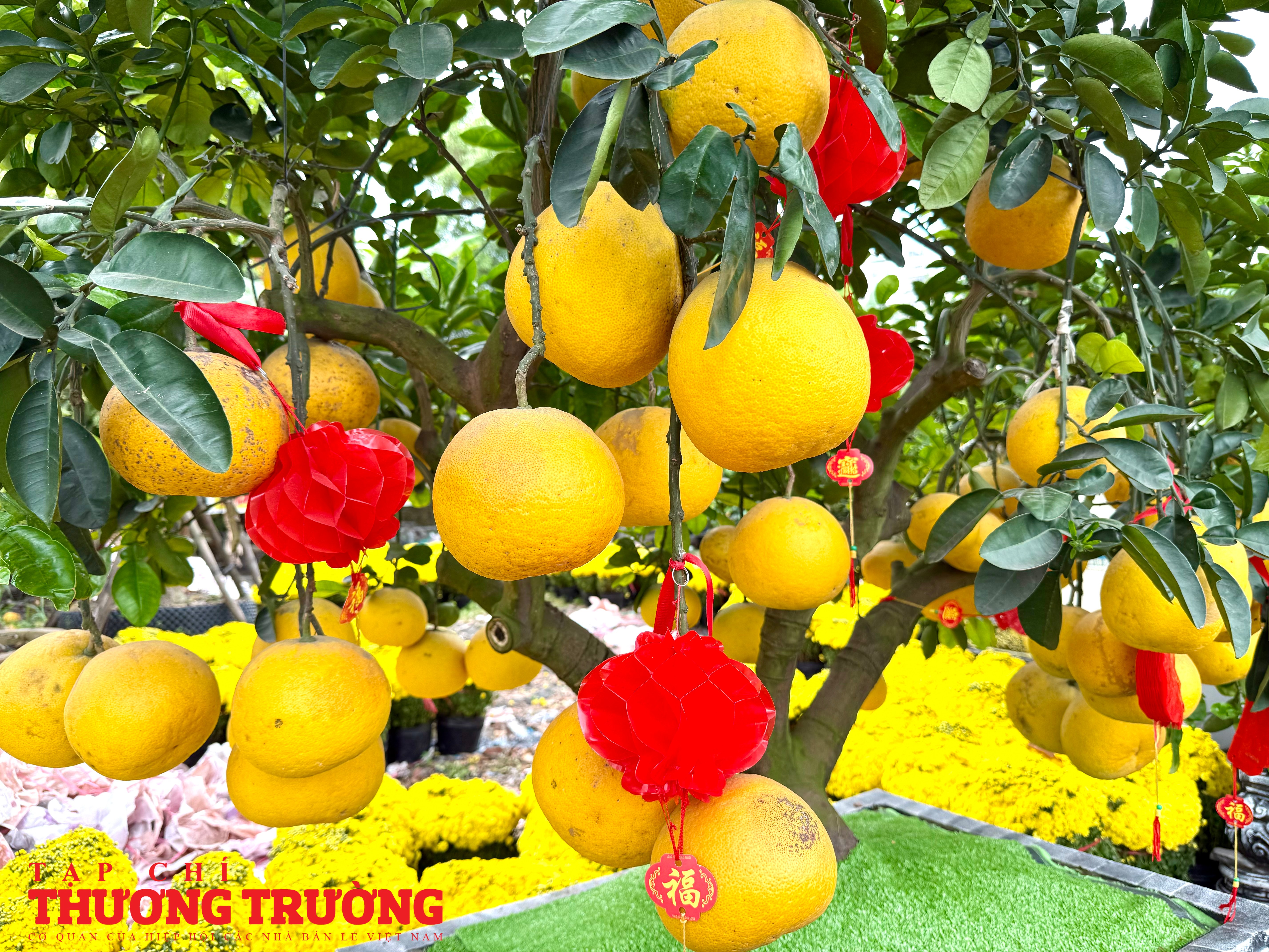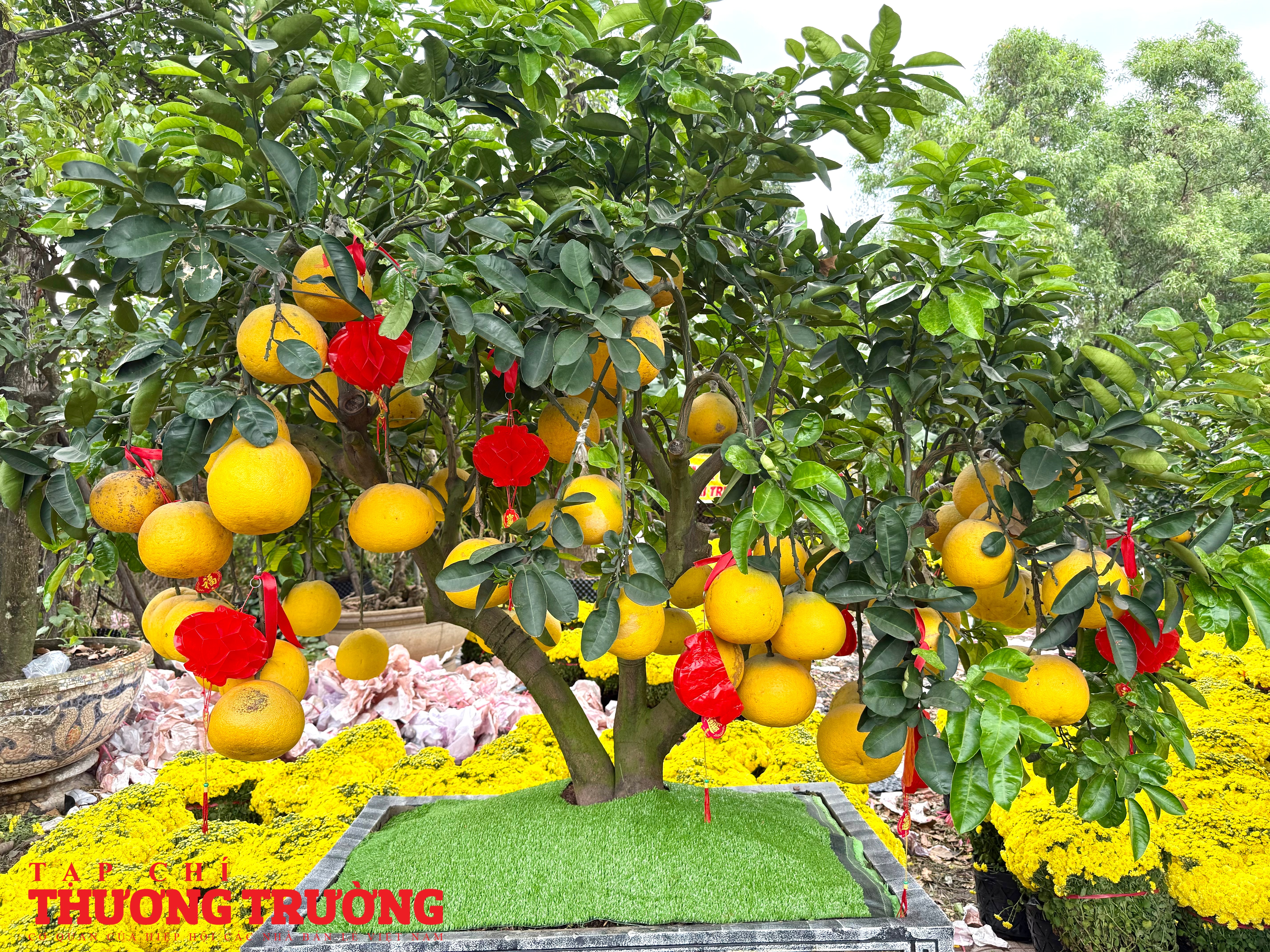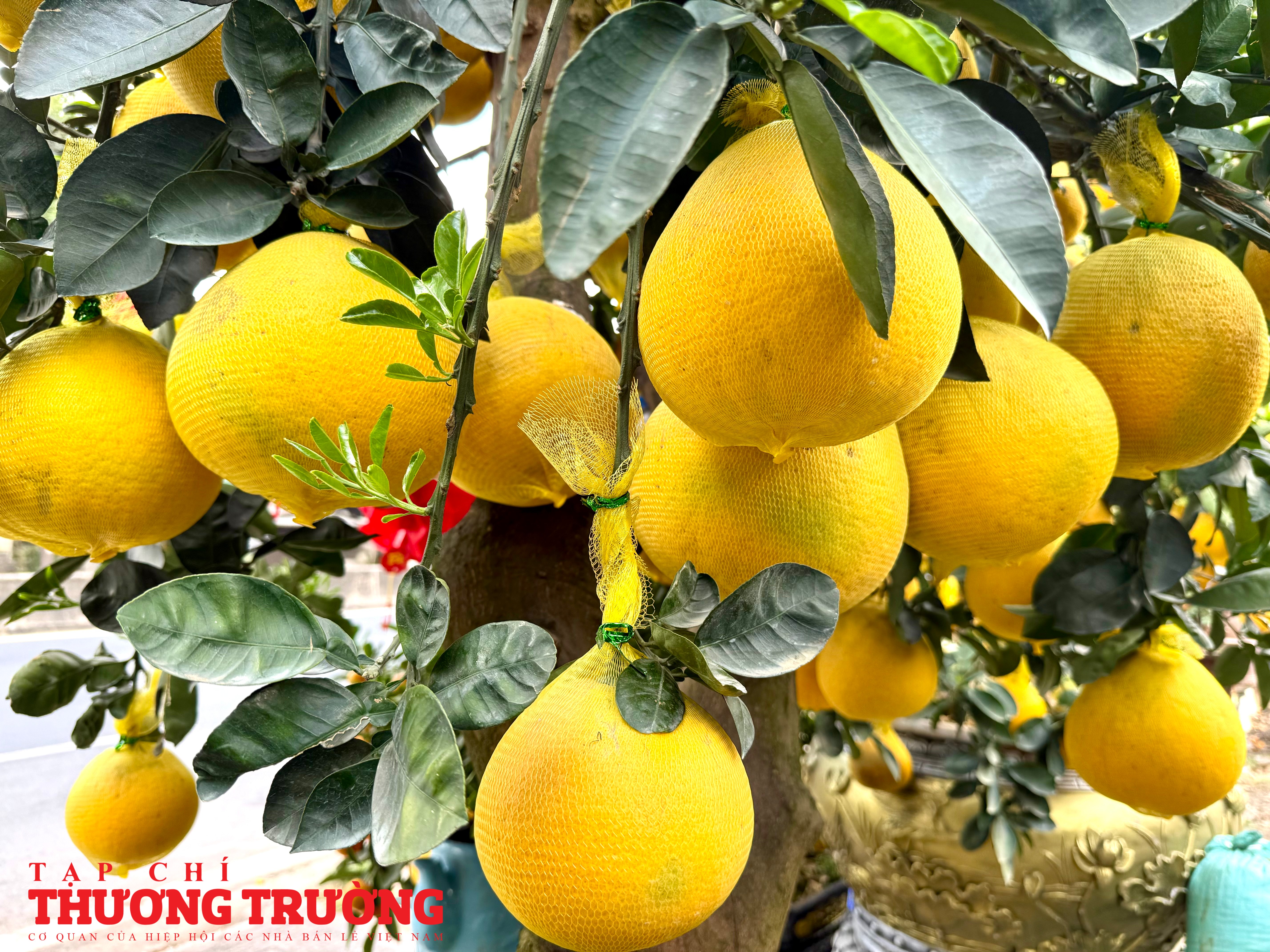 Một số chậu bưởi lớn được trang trí thêm bao lì xì, dây đỏ, câu đối nhỏ để tăng không khí Xuân và giá trị trưng bày.