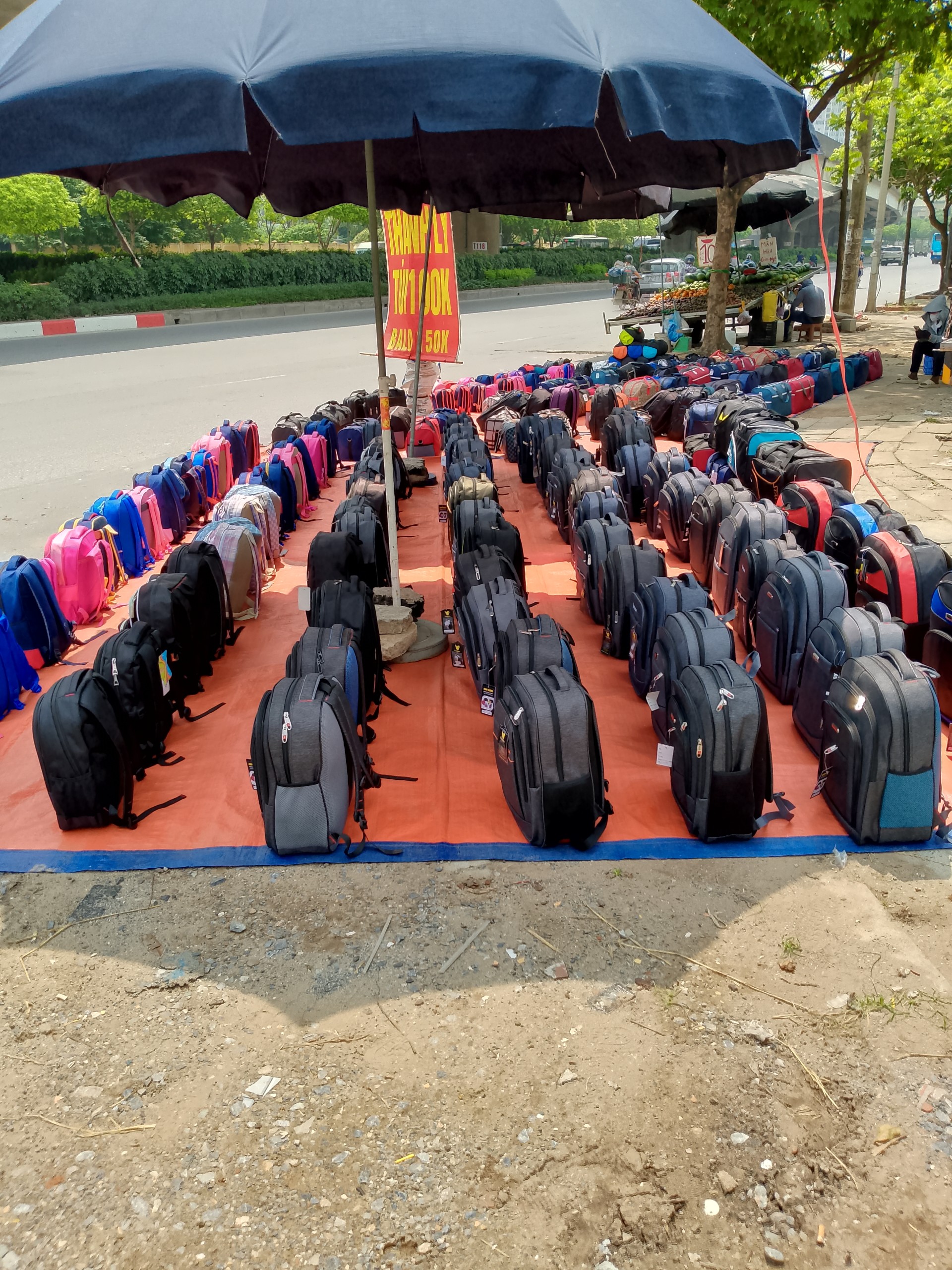 Dọc theo đường Tố Hữu (quận Hà Đông), không khó để bắt gặp những “cửa hàng di động”, tại đây được bày bán đủ loại mặt hàng như túi xách, giày dép, quần áo, mũ lưỡi chai, mũ bảo hiểm… Để mục sở thị, chúng tôi ghé một sạp hàng chuyên bày bán ba lô, túi du lịch và ví cầm tay…Tại đây, các loại túi đều mang thương hiệu nổi tiếng như Gucci, Louis Vuitton, Nike, Adidas… Giá cho mỗi sản phẩm chỉ vài chục nghìn đồng, đắt nhất cũng chỉ 100 nghìn đồng.