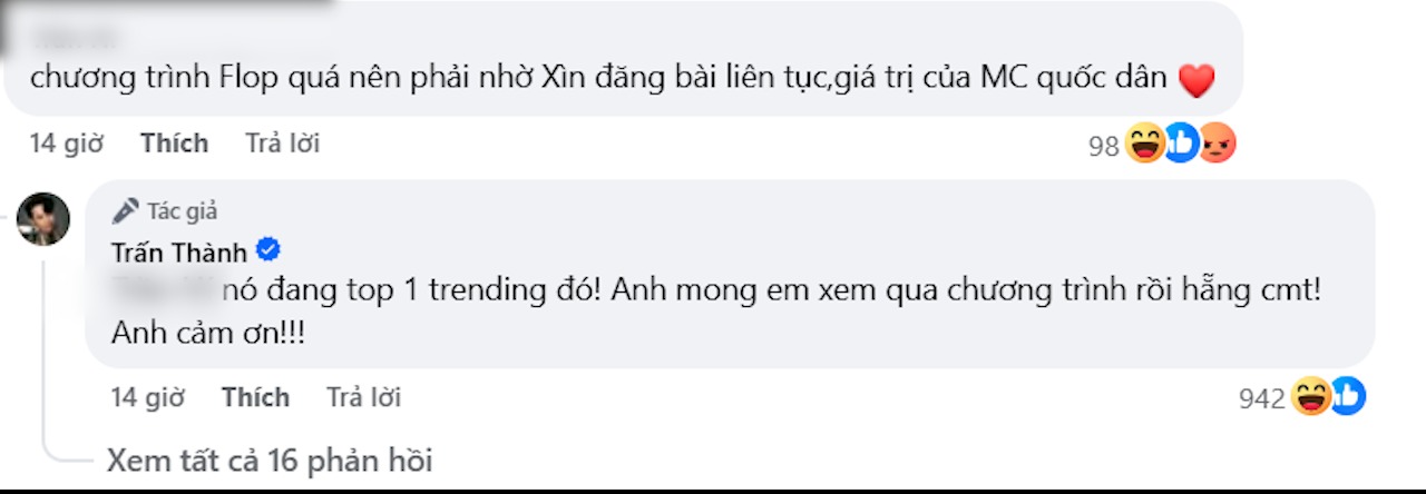 Ngay lập tức, Trấn Thành đáp lại: "Sống hài hước lên bạn ơi! Không ai ép ai hết. Mấy cái này mấy em đó tự tặng và cũng chẳng bao nhiêu với tụi nó cả. Tặng tôi bịch bánh tráng tôi cũng đăng bài cảm ơn! Thoáng lên, sống thoáng lên, cho vui hen. Đừng căng bạn nhé!".