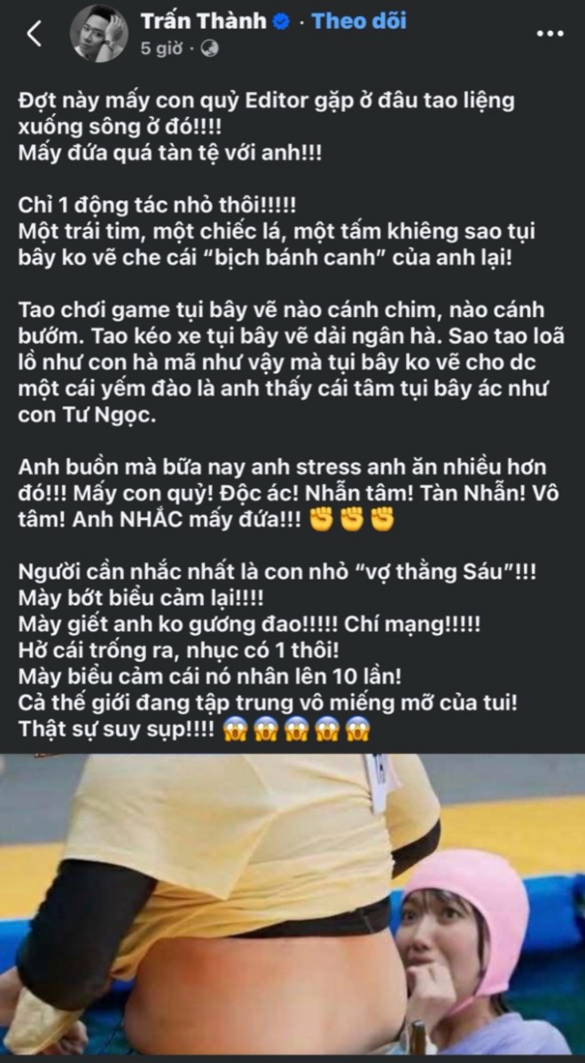 Nhưng thay vì né tránh, Trấn Thành lại chủ động công khai và “than trời”: “Đợt này mấy con quỷ Editor gặp ở đâu tao liệng xuống sông ở đó! Mấy đứa quá tàn tệ với anh! Chỉ một động tác nhỏ thôi, một trái tim, một chiếc lá, sao tụi bây không vẽ che cái ‘bịch bánh canh’ của anh lại!”.