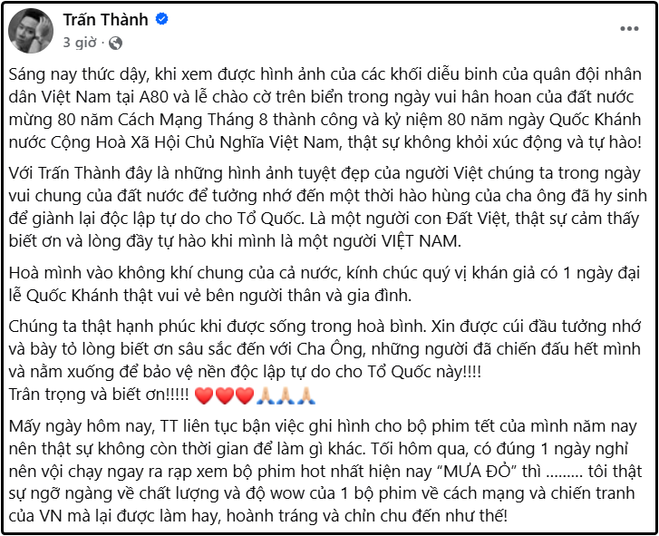 Trấn Thành đã chính thức lên tiếng, chia sẻ cảm xúc biết ơn và tự hào trong ngày Tết Độc Lập 2/9.