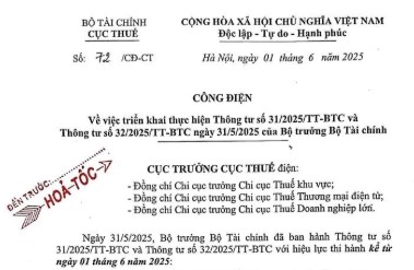 Ngày 1/6, Cục Thuế ra Công Điện số 72/CĐ - CT về việc triển khai thực hiện Thông tư số 31/2025/TT-BTC và Thông tư số 32/2025/TT-BTC ngày 31/5/2025 của Bộ trưởng Bộ tài chính. Các quy định này chính thức có hiệu lực từ ngày 01/6/2025 và được kỳ vọng sẽ góp phần hiện đại hóa hệ thống quản lý thuế, tăng cường tính minh bạch, chống gian lận thương mại và thất thu ngân sách.