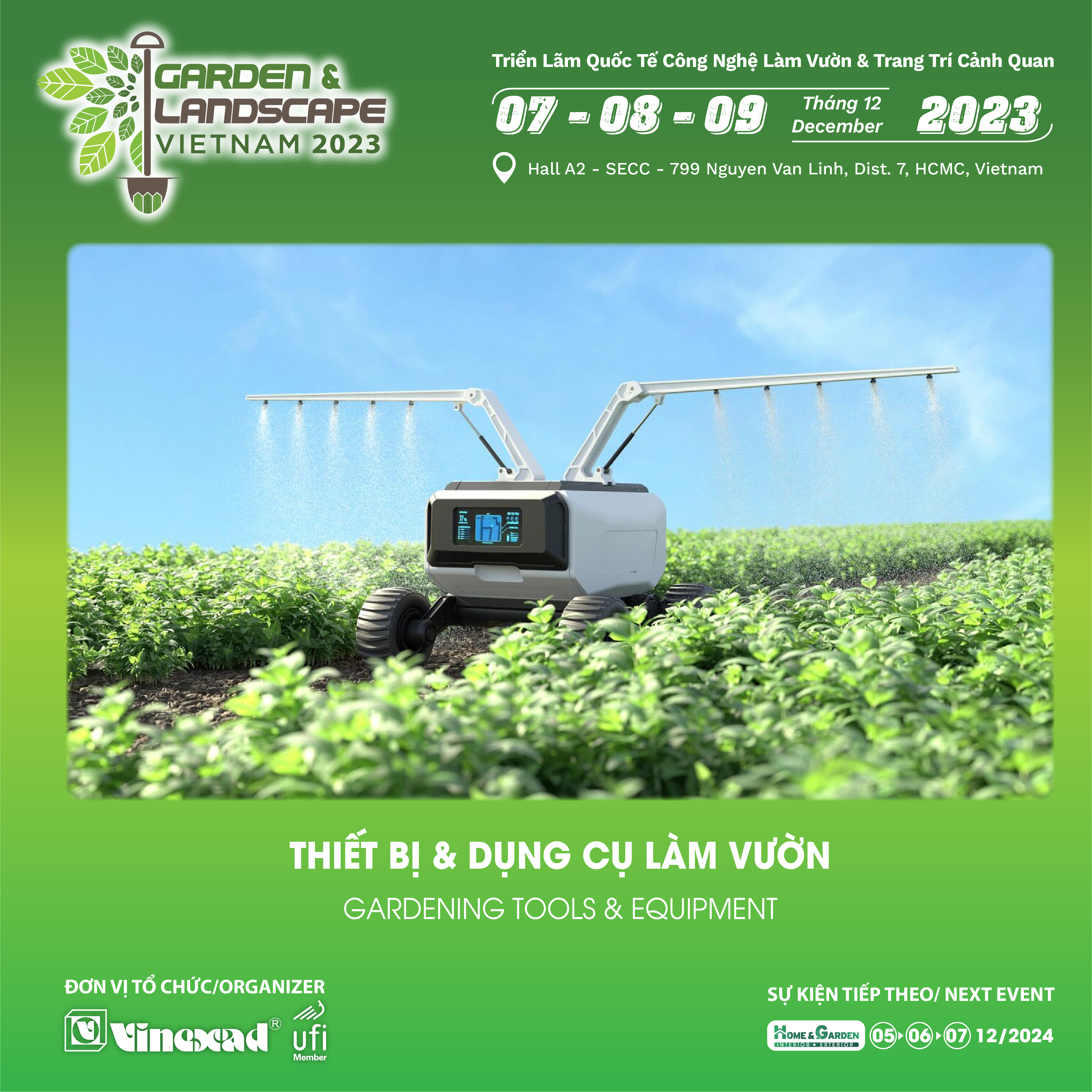 Vietnam Garden & Landscape Expo 2023 nằm trong chuỗi triển lãm quốc tế do Vinexad sẽ diễn ra từ ngày 07 - 09/12 tại Trung tâm Triển lãm & Hội chợ Sài Gòn (SECC) - 799 Nguyễn Văn Linh, P. Tân Phú, Q.7, TP.HCM. Vietnam Garden & Landscape Expo tập trung trưng bày 4 ngành hàng chính (Thiết kế - thi công cảnh quan; Vật liệu xây dựng & ngoại thất; Thiết bị và dụng cụ làm vườn; Nông nghiệp công nghệ cao & năng lượng xanh) và hứa hẹn thu hút hơn 20,000 lượt khách tham quan.