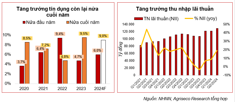 Agriseco Research kỳ vọng thu nhập lãi thuần của toàn hệ thống cả năm 2024 sẽ tăng trưởng tốt khi tín dụng được đẩy mạnh với dư địa tăng trưởng còn lại là khoảng gần 9% trong nửa cuối năm.
