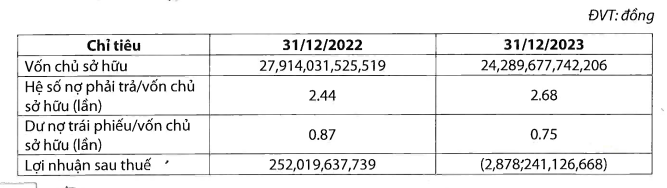 Tại thời điểm 31/12/2023, vốn chủ sở hữu của công ty là 24.290 tỷ đồng, giảm 3.624 tỷ đồng so với một năm trước. Hệ số nợ phải trả/vốn chủ sở hữu tăng lên 2,68 lần, tương ứng với khoản nợ khoảng 65.097 tỷ đồng. Như vậy, tổng tài sản của doanh nghiệp này đạt mức 89.300 tỷ đồng.