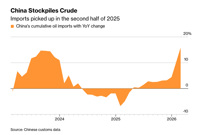 Tốc độ tăng trưởng nhập khẩu dầu thô của Trung Quốc từ 2024 đến tháng 2/2026 (Nguồn: Bloomberg, Cục Hải quan Trung Quốc)