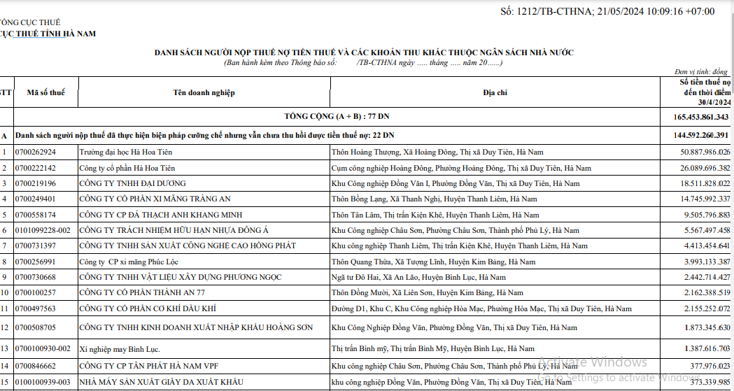 Cục Thuế tỉnh Hà Nam vừa thực hiện công khai thông tin 77 người nộp thuế còn nợ tiền thuế và các khoản thu khác thuộc ngân sách nhà nước tính đến thời điểm ngày 30/4/2024.