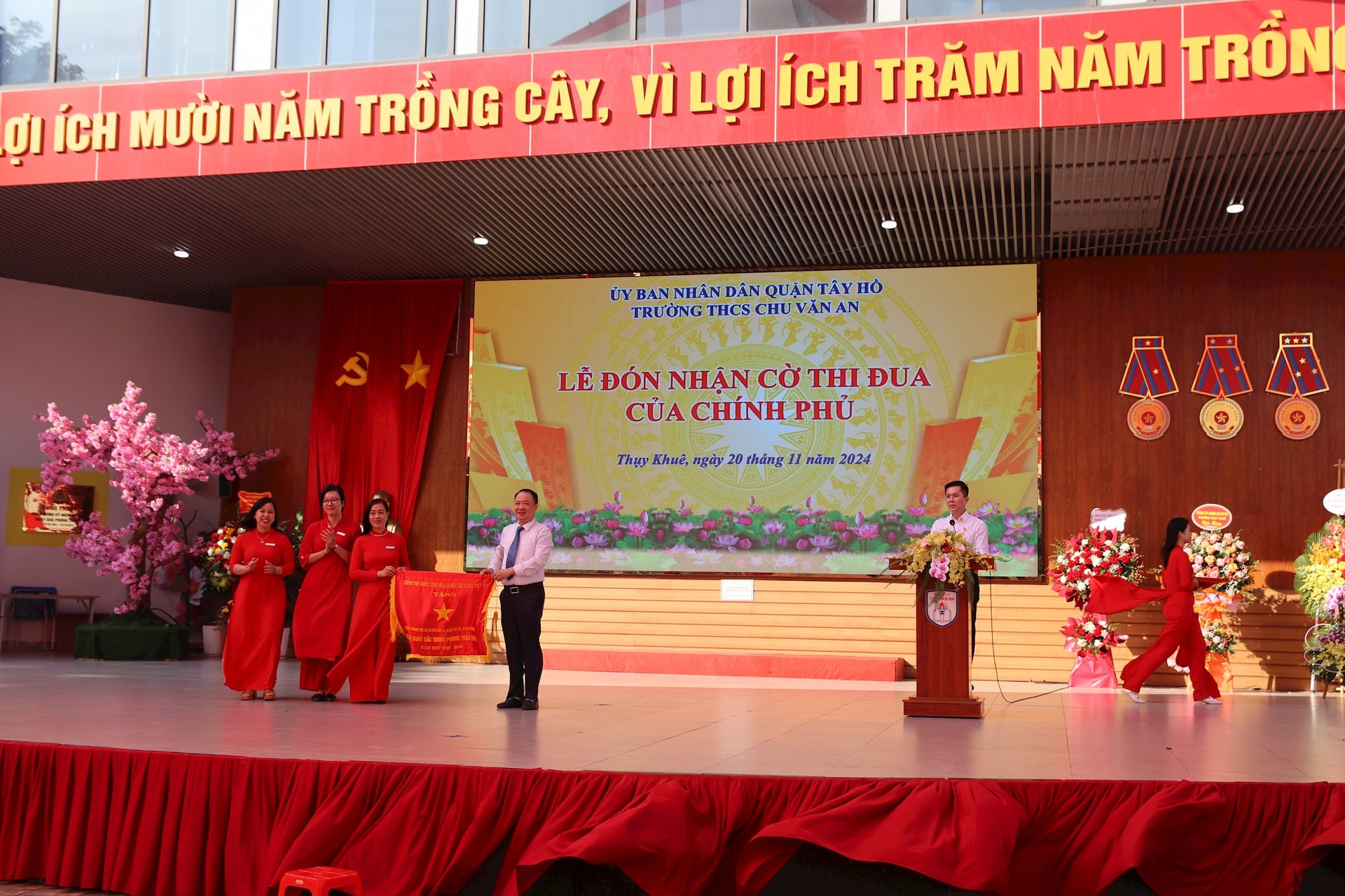Trong những năm qua, Cấp ủy Chi bộ, Ban giám hiệu nhà trường luôn linh hoạt, chủ động sáng tạo trong công tác quản lý, chỉ đạo, điều hành, đổi mới phương pháp dạy và học. Để ghi nhận những kết quả đạt được của Thầy và trò trường THCS Chu Văn An trong năm học 2023 - 2024, ngày 15/11/2024 Thủ tướng Chính phủ ký Quyết định số 1391 về việc tặng cờ thi đua của Chính phủ cho nhà trường. Thay mặt các đồng chí lãnh đạo Quận, chúc mừng và biểu dương những thành tích của nhà trường.