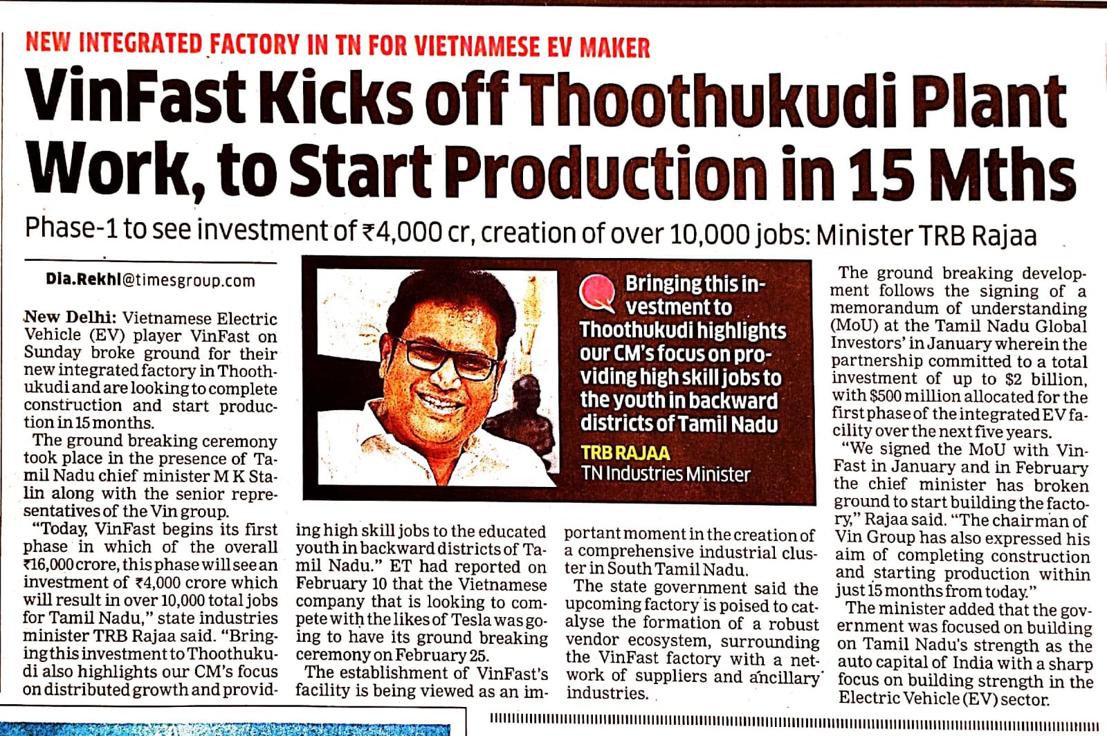 Trong khi đó, The New Indian Express dẫn lời Bộ trưởng Bộ Công nghiệp bang Tamil Nadu T.R.B. Rajaa nhận định, nhà máy VinFast tại Thoothukudi sẽ hiện thực hóa tầm nhìn của Chính quyền bang về tăng trưởng phi tập trung, tạo việc làm cho những lao động tay nghề cao ở các khu vực xa trung tâm. Với sự xuất hiện của nhà máy VinFast, Đặc khu kinh tế Naguneri tại bang Tamil Nadu sẽ sớm hồi sinh.