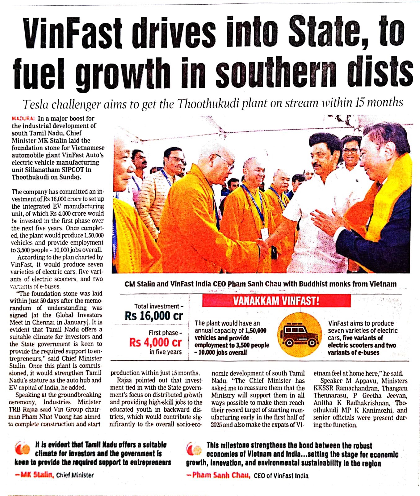 Hãng tin PTI của Ấn Độ khẳng định, lễ động thổ nhà máy của VinFast là dấu mốc quan trọng đưa miền Nam Tamil Nadu bước vào một “hành trình thịnh vượng”.