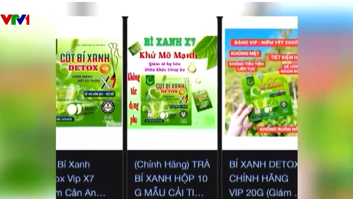 Thực phẩm chức năng giảm cân bệnh nhân sử dụng có tên là " Cốt bí xanh Detox vip X7", dạng bột, hòa tan trong nước, uống như trà, và được quảng cáo là hỗ trợ giảm béo tiêu mỡ. Xét nghiệm loại trà này, phát hiện một loại chất gây chán ăn đã bị cấm sử dụng. Ảnh: VTV