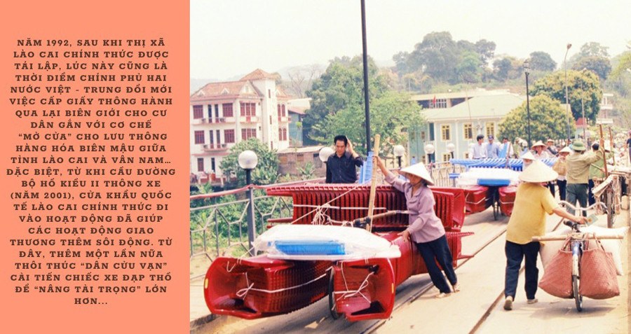 Không phải đến khi tái lập tỉnh tháng 10/1991, mà trước đó vài năm, trên khu vực biên giới Lào Cai (Việt Nam) - Hà Khẩu (Trung Quốc), hoạt động giao thương ở những chợ đường biên, lối mở đã nhộn nhịp. Cũng từ đây, một nghề mới ra đời gọi là “cửu vạn”. Danh từ “dân cửu vạn” được đặt cho những người làm nghề vận chuyển hàng hóa qua lại biên giới không hề có hàm ý xấu mà đã trở nên quen thuộc. Hồi đó, khi cầu đường bộ chưa có, những người đi chợ đường biên thường mang hàng chất lên thuyền chở qua sông biên giới, rồi tập kết lên bến sông Nậm Thi (phố Tèo), khu Gốc Nhót (Duyên Hải) và Lục Cẩu (Quang Kim, Bát Xát) bên bãi sông Hồng. Từ đây, hàng hóa được chất lên xe đạp thồ chở về Kim Tân, Phố Mới, sau đó đưa xuống ga Phố Lu hoặc đi đường Bản Phiệt, theo Quốc lộ 70 để về xuôi. Chiếc xe đạp thồ trở thành phương tiện “đặc chủng” hỗ trợ cư dân vận chuyển hàng hóa qua biên giới.