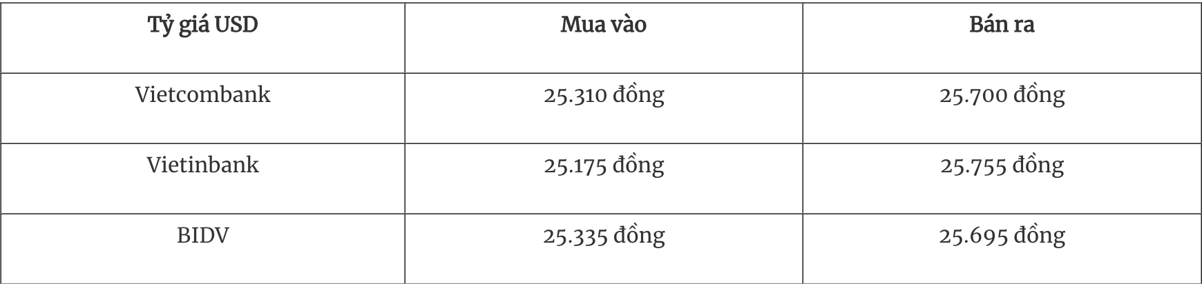 Tỷ giá USD tại một số ngân hàng thương mại mua vào và bán ra như sau: