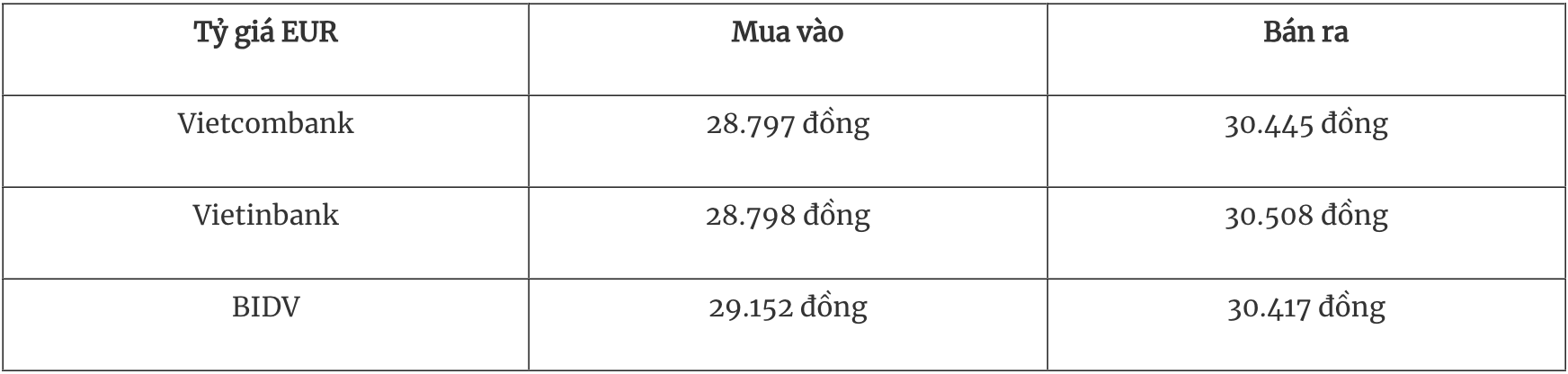 Tỷ giá EUR tại một số ngân hàng thương mại mua vào và bán ra như sau: