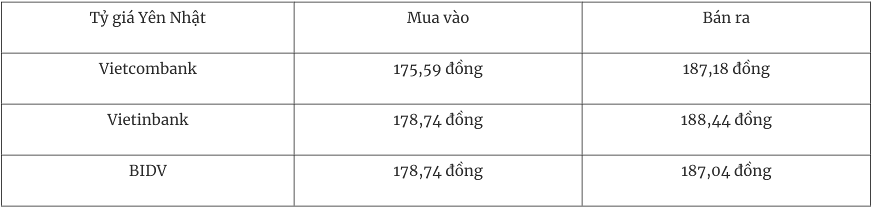 Tỷ giá YEN tại một số ngân hàng thương mại mua vào và bán ra như sau: