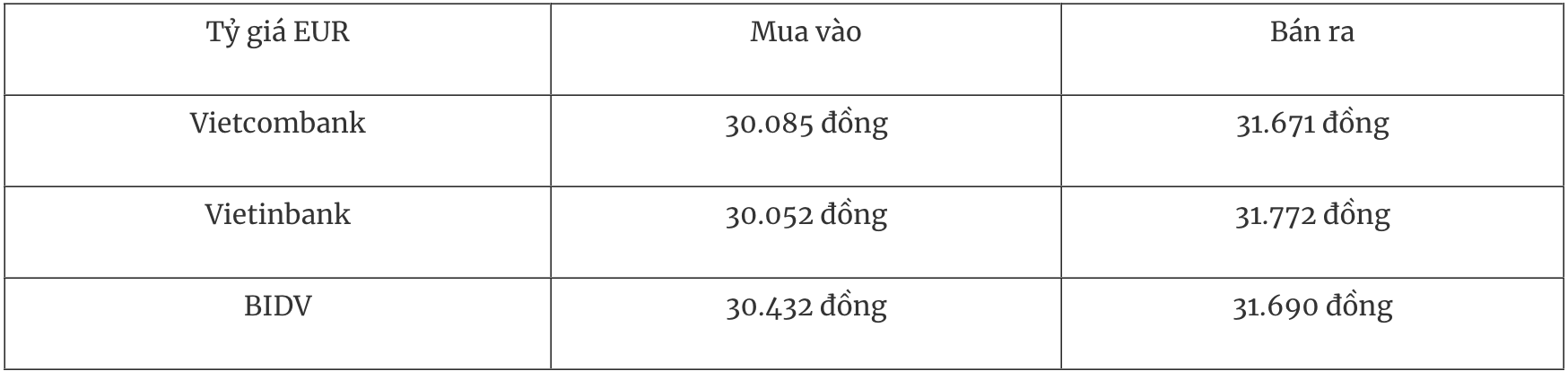 Tỷ giá EUR tại một số ngân hàng thương mại mua vào và bán ra như sau: