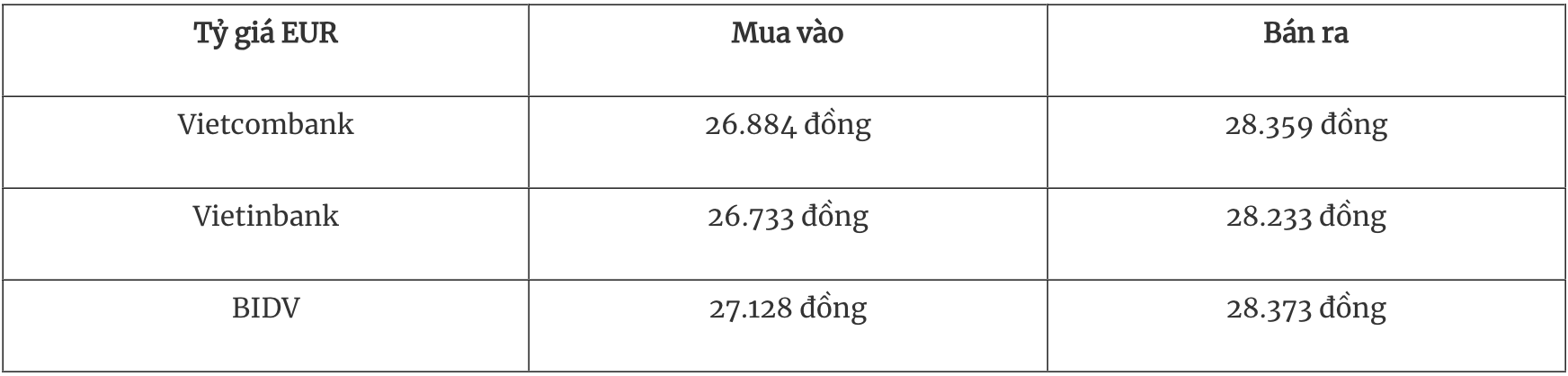 Tỷ giá EUR tại các ngân hàng thương mại mua vào và bán ra như sau: