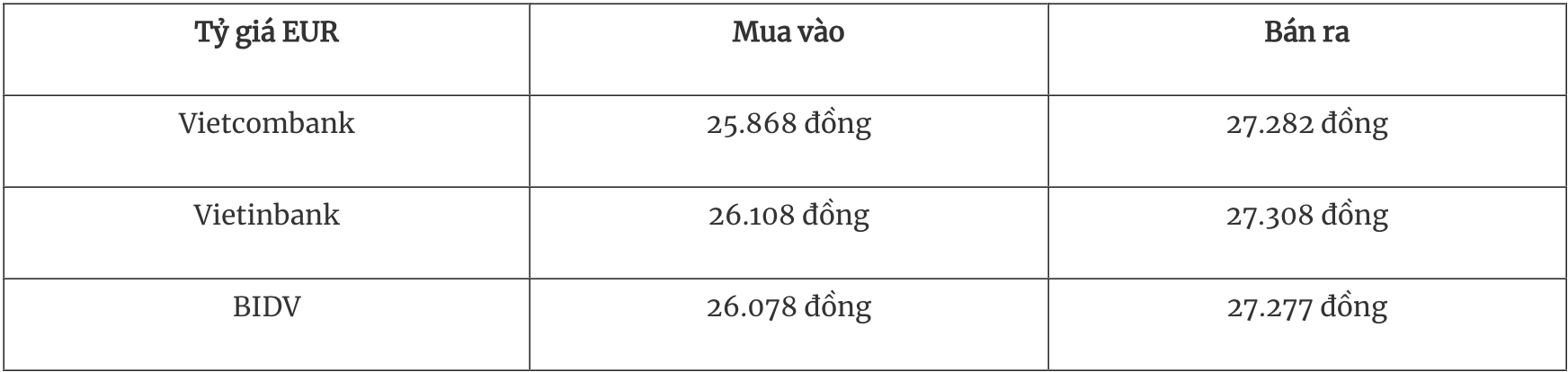 Tỷ giá EUR tại các ngân hàng thương mại mua vào và bán ra như sau: