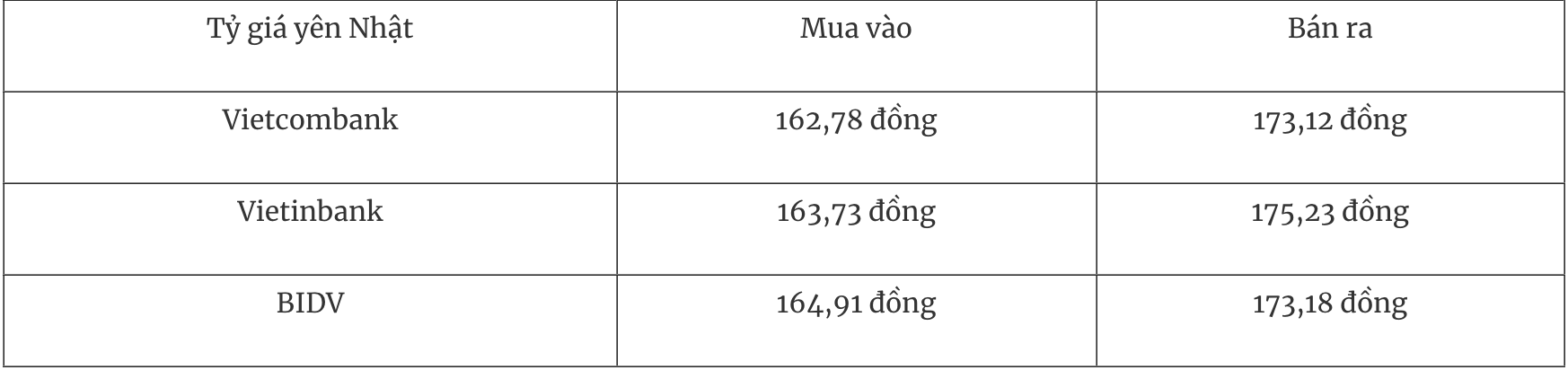 Tỷ giá yên Nhật tại một số ngân hàng thương mại mua vào và bán ra như sau: