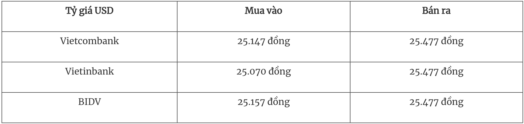 Tỷ giá USD tại các ngân hàng thương mại mua vào và bán ra như sau: