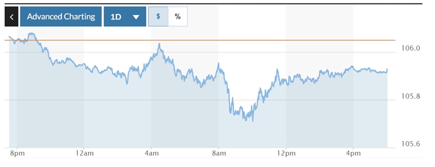 Trên thị trường Mỹ, chỉ số US Dollar Index (DXY) đo lường biến động đồng bạc xanh với 6 đồng tiền chủ chốt (EUR, JPY, GBP, CAD, SEK, CHF) giảm 0,12%, xuống mốc 105,93.