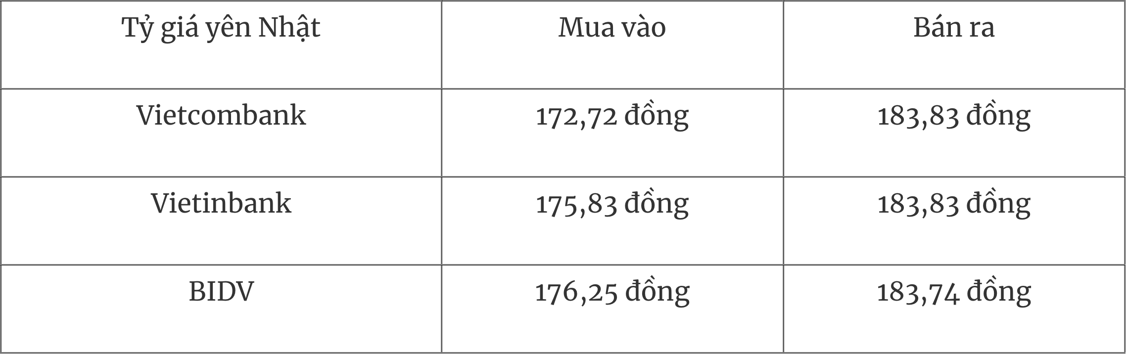 Tỷ giá yên Nhật tại một số ngân hàng thương mại mua vào và bán ra như sau: