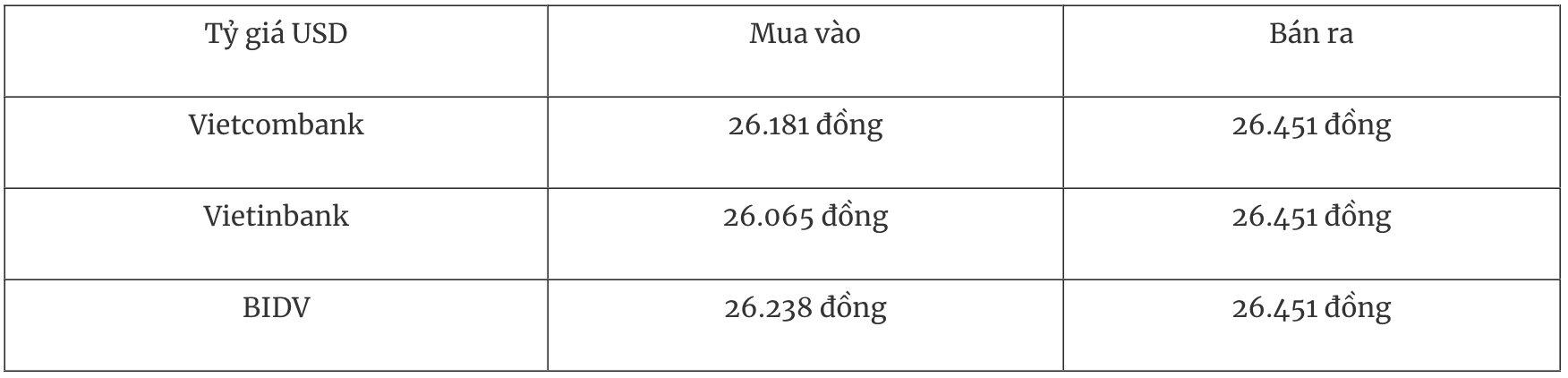 Tỷ giá USD tại một số ngân hàng thương mại mua vào và bán ra như sau: