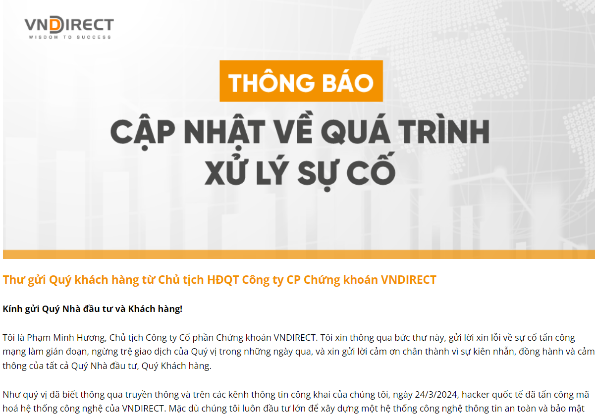 Tại buổi Họp báo thường kỳ quý I/2024 của Bộ Tài chính, ông Phạm Hồng Sơn - Phó Chủ tịch Uỷ ban Chứng khoán Nhà nước (UBCKNN) nhận định sự cố hệ thống của Công ty Cổ phần chứng khoán VNDIRECT là sự cố đáng tiếc bởi bị hacker chuyên nghiệp tấn công.