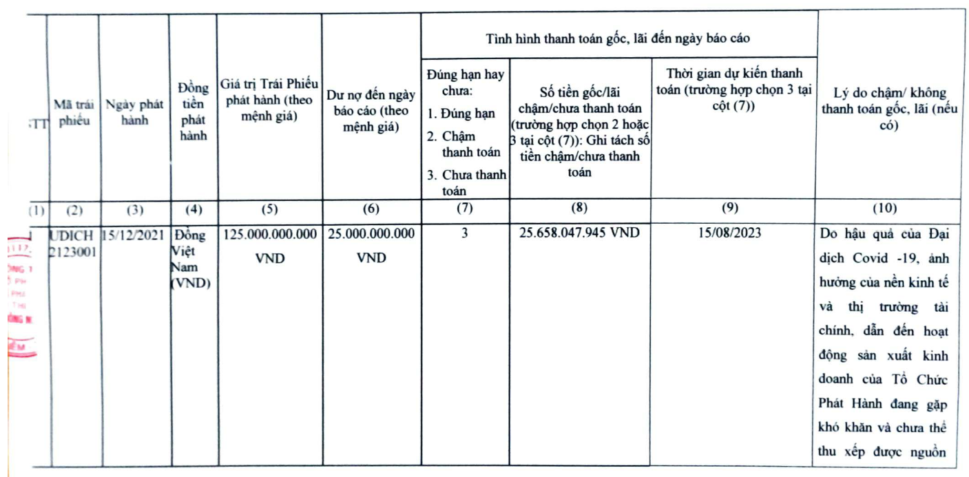Trước đó, trái phiếu mã UDICH2123001 đáo hạn ngày 15/6/2023, Udideco cho biết đã trả xong tiền lãi của lô trái phiếu trên. Tuy nhiên, doanh nghiệp mới chỉ thanh toán được 35 tỷ đồng tiền gốc trái phiếu. Số tiền chậm thanh toán còn 90 tỷ đồng (tính đến ngày 15/6).
