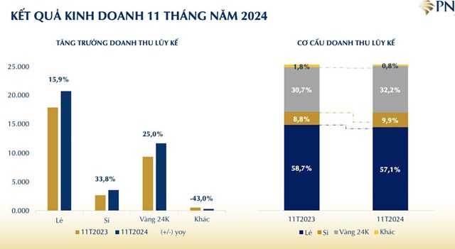 Song song đó, trong bối cảnh thị trường thắt chặt các yêu cầu về kiểm soát nguồn gốc sản phẩm tạo lợi thế cho các nhà sản xuất uy tín, chất lượng và tuân thủ tốt các quy định góp phần đưa doanh thu trang sức bán sỉ của công ty trong 11 tháng năm 2024 tăng 33,8% so với cùng kỳ, đạt 3.485 tỷ đồng.