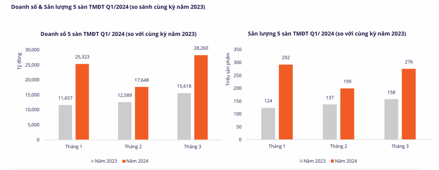 Dự báo trong quý 2-2024, tổng doanh số trên 5 sàn bán lẻ trực tuyến lớn nhất Việt Nam hiện nay sẽ đạt mức 84,87 nghìn tỷ đồng với 882,12 triệu đơn vị sản phẩm được bán ra; tăng lần lượt 19,2% và 13,57% so với quý 1-2024.