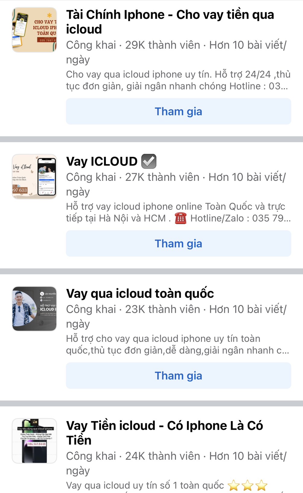 Chỉ cần gõ trên mạng xã hội cụm từ “vay tiền bằng iCloud” sẽ cho ra một loạt những hội nhóm với hàng chục nghìn thành viên quảng cáo dịch vụ cho vay tiền qua iCloud. Theo lời quảng cáo của các đối tượng cho vay thì một lần vay qua iCloud có thể vay được từ 3 triệu đến 20 triệu.