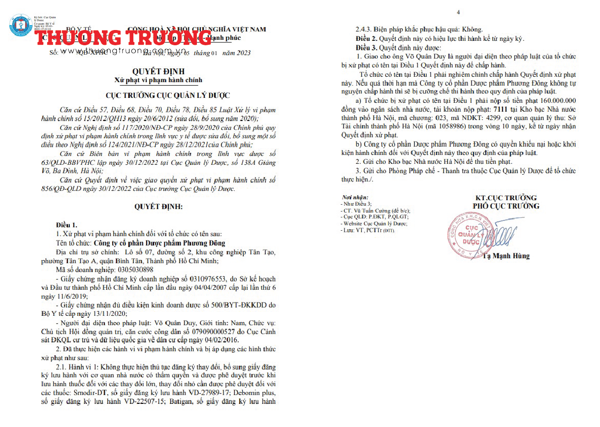 Cụ thể, theo Quyết định số 7/QĐ-XPHC ngày 5/01/2023 của Cục Quản lý Dược, Công ty cổ phần Dược phẩm Phương Đông (địa chỉ trụ sở chính: Lô số 7, đường số 2, khu công nghiệp Tân Tạo, phường Tân Tạo A, quận Bình Tân, TP.HCM) đã vi phạm hành chính do Không thực hiện thủ tục đăng ký thay đổi, bổ sung giấy đăng ký lưu hành với cơ quan nhà nước có thẩm quyền và được phê duyệt trước khi lưu hành thuốc đối với các thay đổi lớn, thay đổi nhỏ cần được phê duyệt đối với các loại thuốc: Smodir-DT, số giấy đăng ký lưu hành VD-27989-17; Debomin plus, số giấy đăng ký lưu hành VD-22507-15; Batigan, số giấy đăng ký lưu hành QLĐB-729-18; Omcetti, số giấy đăng ký lưu hành VD-24840-16; Mumcal, số giấy đăng ký lưu hành VD-20804-14; Tyrozet, số giấy đăng ký lưu hành VD31836-19; Devitoc, số giấy đăng ký lưu hành VD-19426-13; Fudcime, số giấy đăng ký lưu hành VD-23642-15. Đặc biệt, Công ty này đã có vi phạm nhiều lần đối với nhiều thuốc.