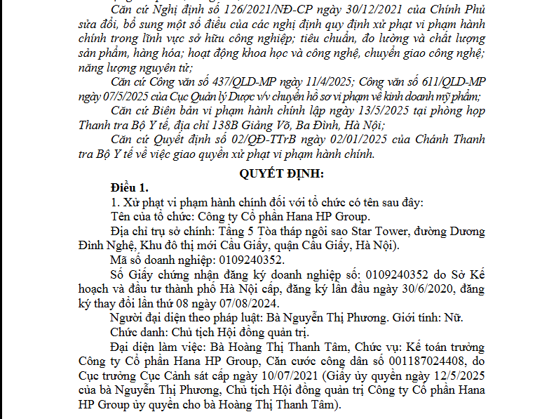 Theo quyết định, Công ty Cổ phần Hana HP Group đã có hành vi kinh doanh hàng hóa trên nhãn có hình ảnh, hình vẽ, chữ viết, dấu hiệu, biểu tượng, huy chương, giải thưởng và các thông tin khác không đúng bản chất, không đúng sự thật về hàng hóa đó đối với sản phẩm là mỹ phẩm: USOLAB VITA ION-C SOLUTION, phiếu công bố sản phẩm mỹ phẩm số: 203251/23/CBMP-QLD), nhập khẩu theo tờ khai hàng hóa nhập khẩu số 105601893611 ngày 24/7/2023, giá trị hàng hóa: 24.809.509 đồng (được Cục Quản lý Dược xác định giá trị tại Công văn số 611/QLD-MP ngày 7/5/2025 và căn cứ theo Điều 60 Luật Xử lý vi phạm hành chính năm 2012).