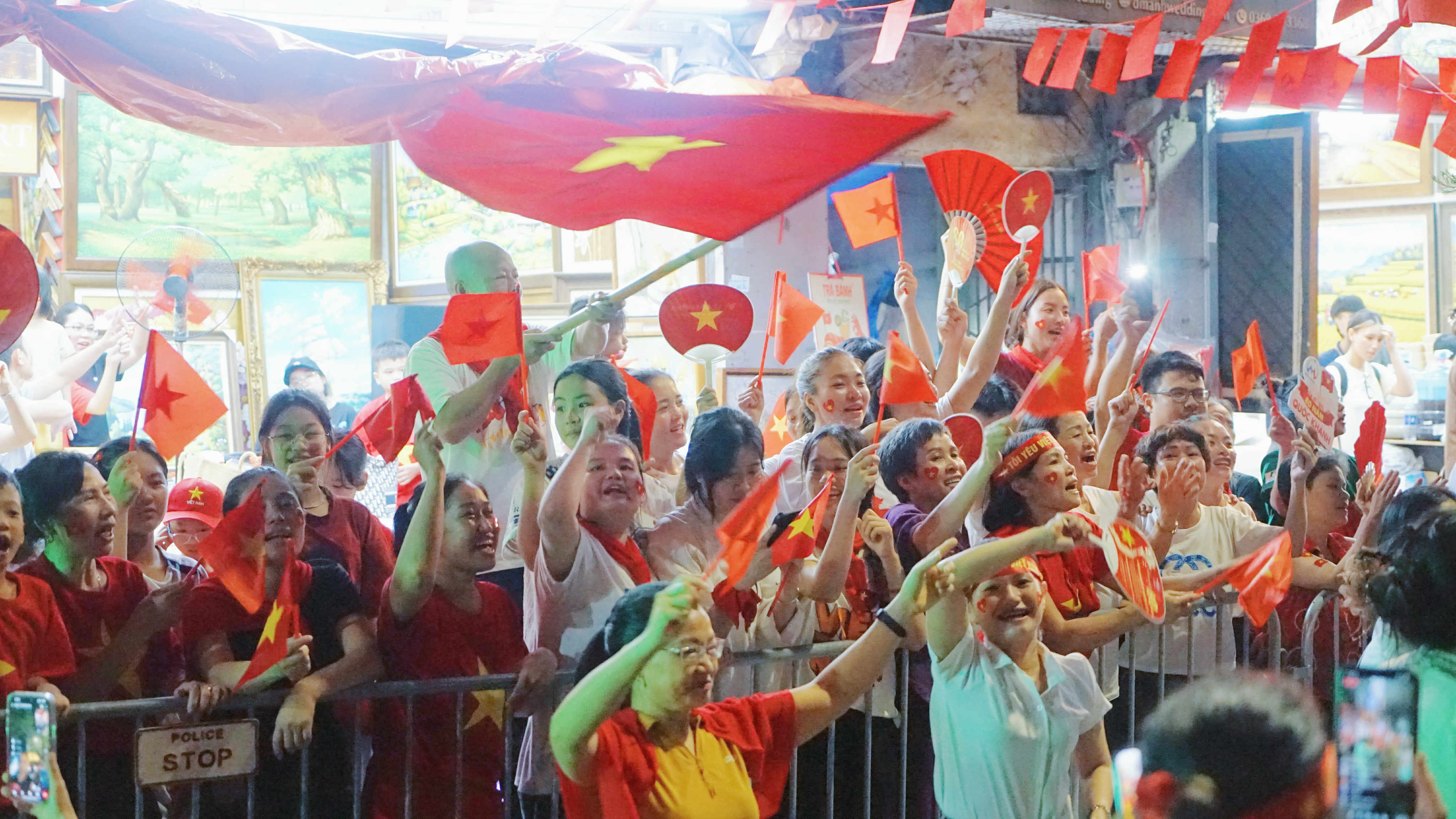 Không quản khuya muộn, hàng nghìn người dân đã ngồi chật kín các tuyến phố. Nhiều gia đình mang theo con nhỏ, nhiều bạn trẻ khoác trên mình màu áo đỏ sao vàng, dán cờ Tổ quốc lên má, tay cầm quốc kỳ phấp phới.