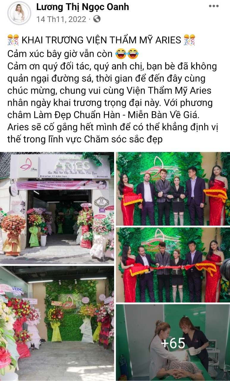 Trong khi đó, trên mạng xã hội facebook vẫn còn một số tài khoản đăng nhiều thông tin hình ảnh quảng cáo về Viện thẩm mỹ Aries. Trong đó có tài khoản mang tên Nguyễn Thị Ngọc Oanh (trùng tên với người đại diện pháp luật của Công ty TNHH Viện thẩm mỹ Aries) đăng nhiều hình ảnh về lễ khai trương Viện thẩm mỹ Aries và các hình ảnh đào tạo học viên. Cùng với đó là các video phát trực tiếp việc thực hiện các dịch vụ thẩm mỹ cho khách như: treo cung mí mắt, nâng mũi, cắt mí ghép mỡ... Bài đăng gần nhất là vào ngày 23/2/2023.
