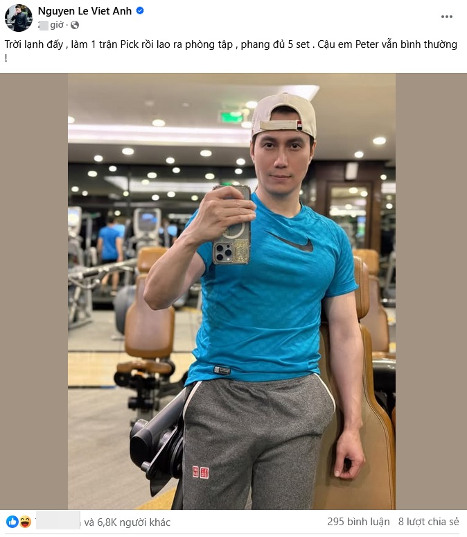 Theo đó, nam diễn viên loạt phim giờ vàng của VTV đăng bức ảnh vừa đi tập gym kèm status: "Trời lạnh đấy, làm 1 trận Pick rồi lao ra phòng tập, phang đủ 5 set. Cậu em Peter vẫn bình thường."